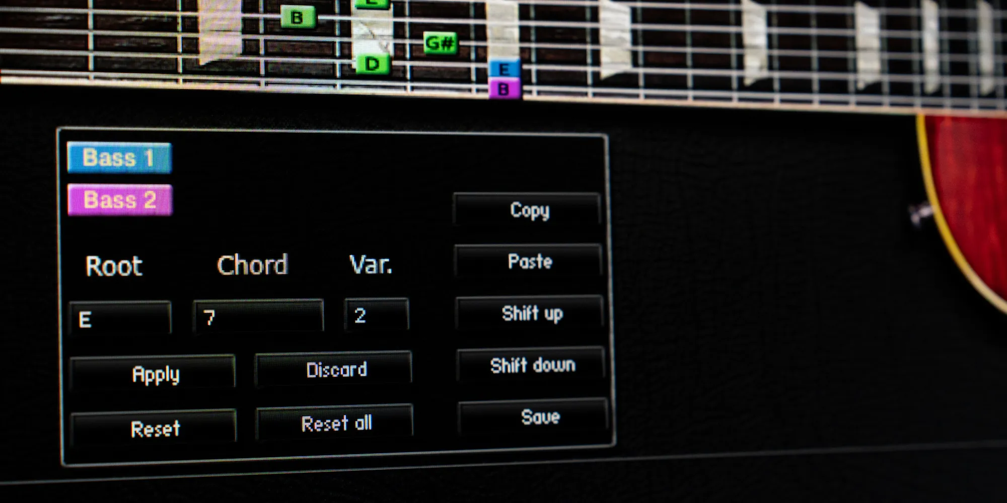 Detects 33 chord types and relays them to realistic fingerings across the fretboard in four positions. Use built-in TABs or create your own with the custom editor.