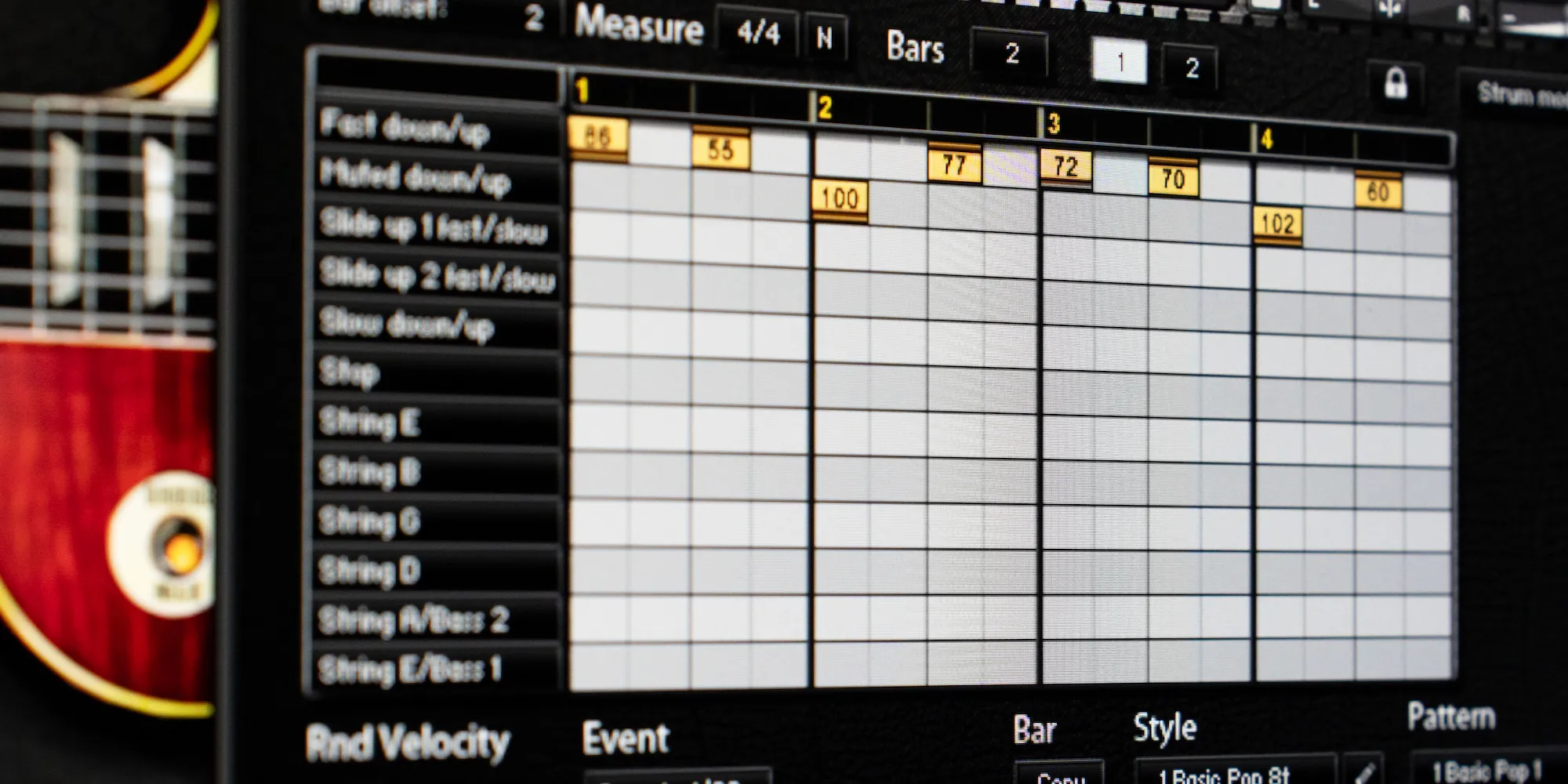 Import/export patterns, style saving, RealGuitar pattern support, latch mode, velocity randomization, chord FX, swing, song mode, and more — every tool to create convincing electric rhythm or lead guitar tracks with zero compromise.