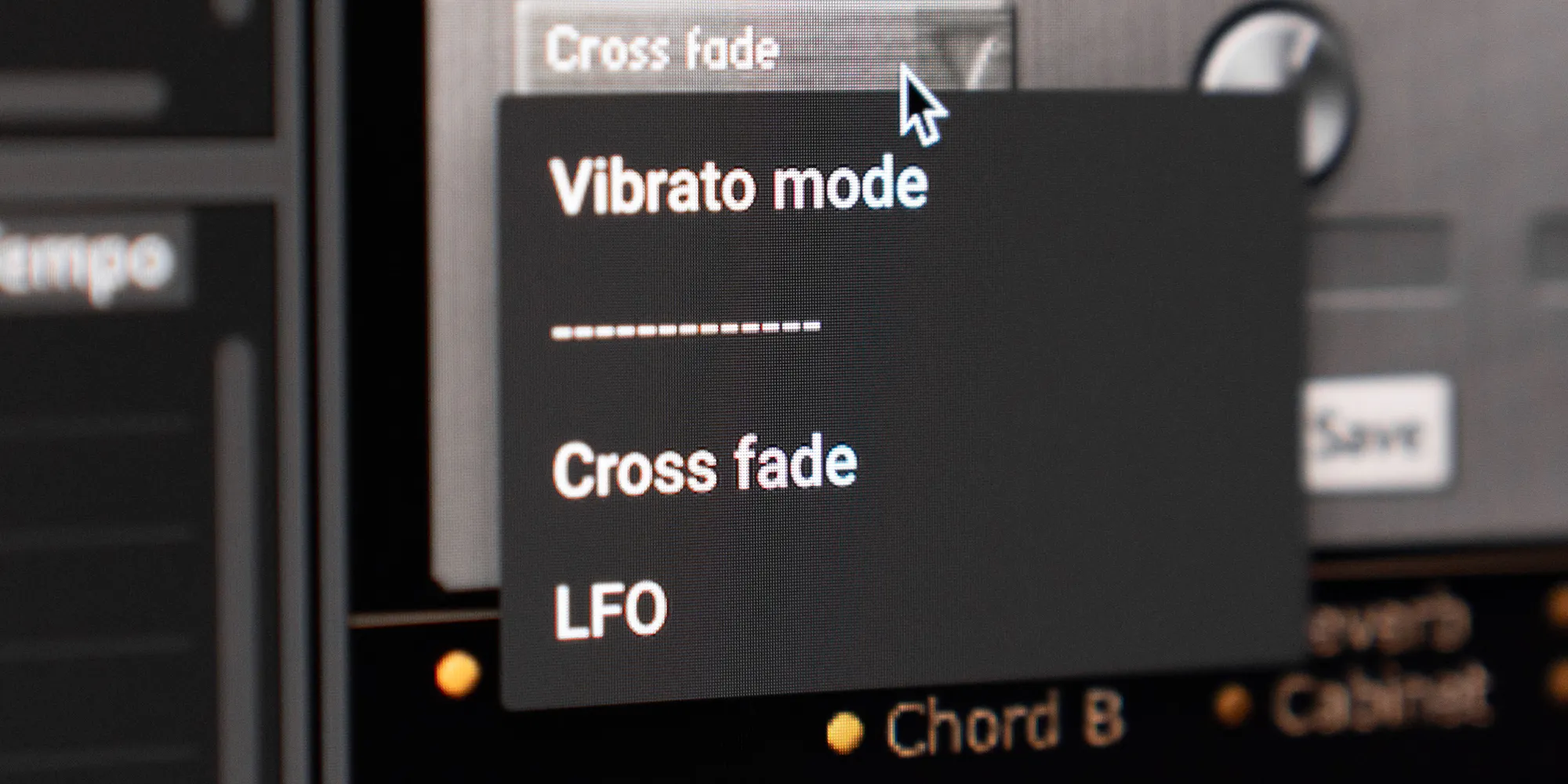 Use real vibrato with key or mod wheel, or switch to LFO mode for synth-like control. Speed and intensity are adjustable via CC.