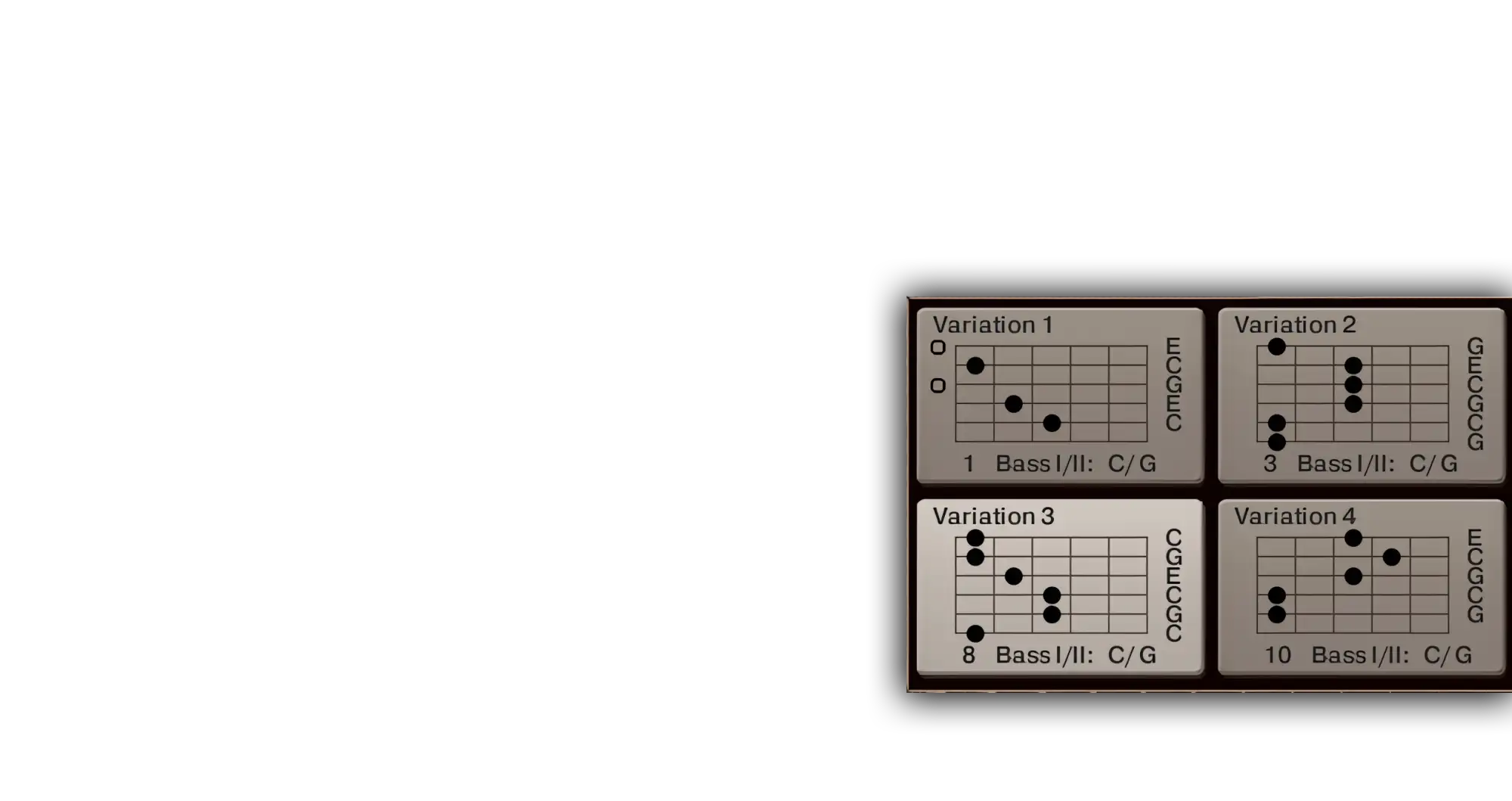 The engine supports 33 chord types, including complex jazz and rock extensions, and recognizes them in real time from your MIDI input. Each chord comes with four different fretboard voicings, giving you variation in color and position. You can switch positions via keyswitches or by playing in different octaves. A full chord editor lets you modify or create any voicing you need and save it across sessions.