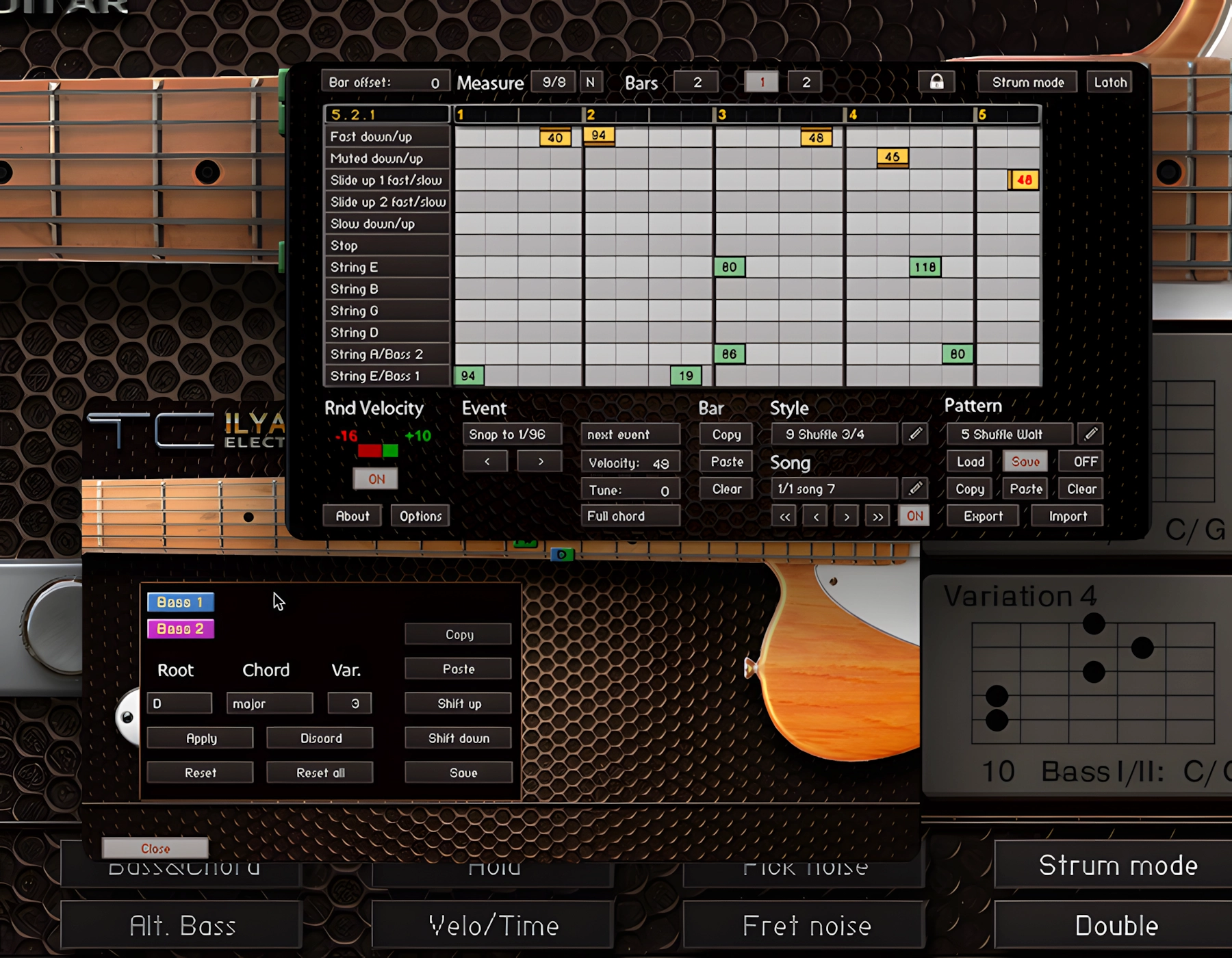 - 250 factory and 70 custom patterns for auto strumming